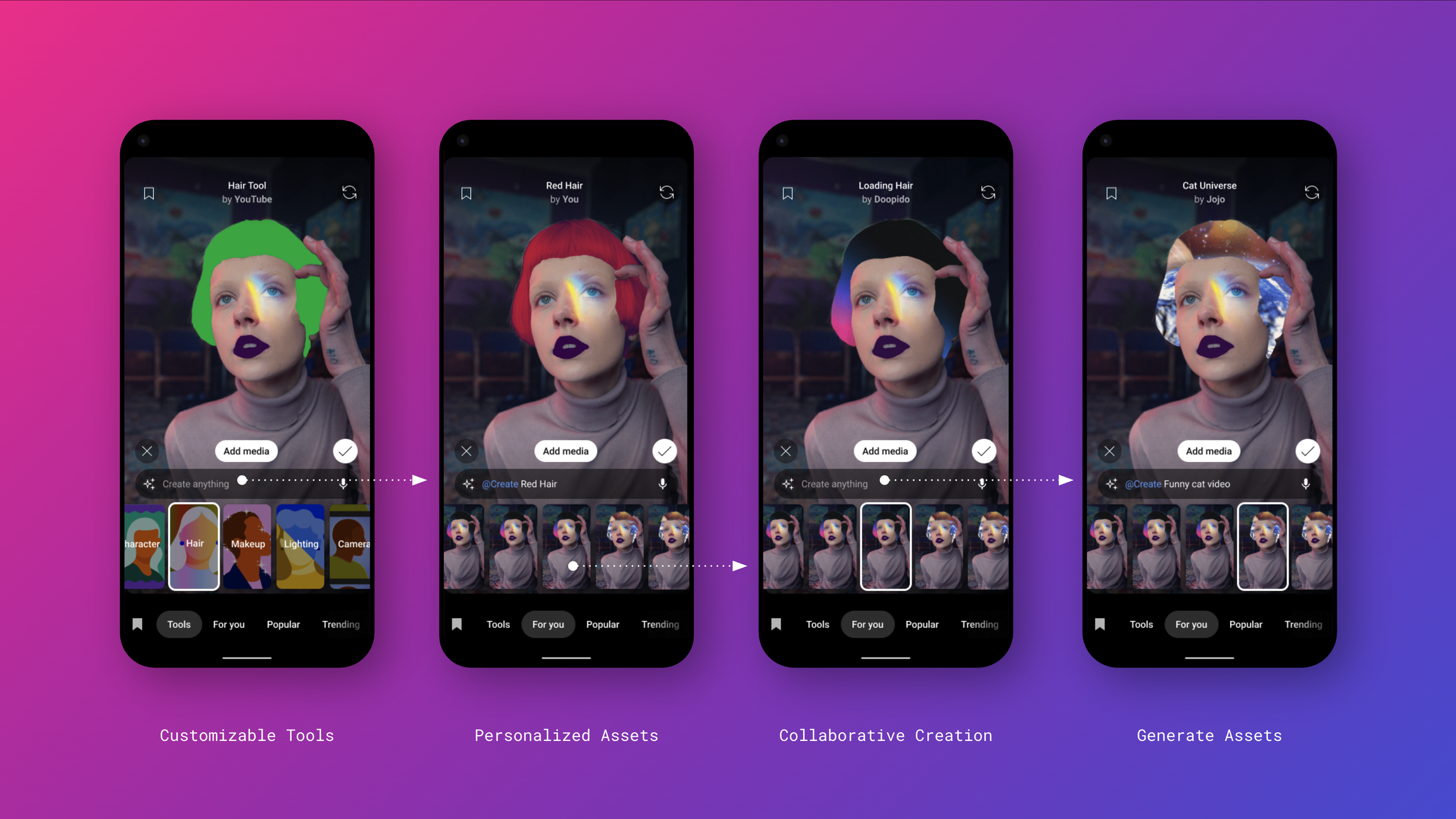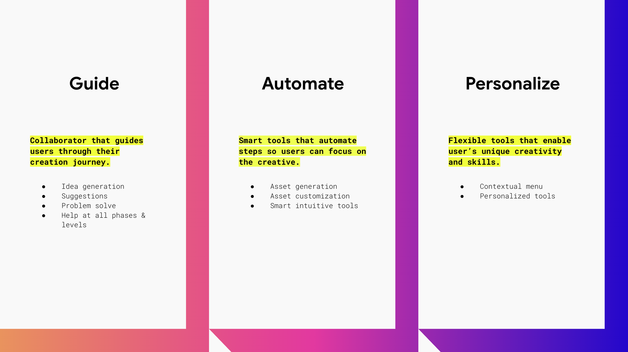 Our research showed that users want AI to support them throughout the creation journey, automating difficult steps while offering flexibility. From these insights, we hypothesized that AI can enable scalable tools to guide, automate, and personalize creation.